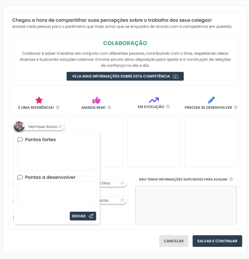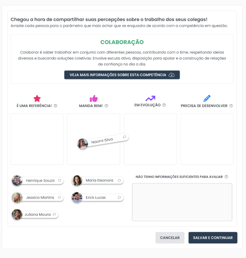 - Use o mouse para arrastar cada pessoa para o parâmetro que você considera mais adequado de acordo com a competência avaliada.
