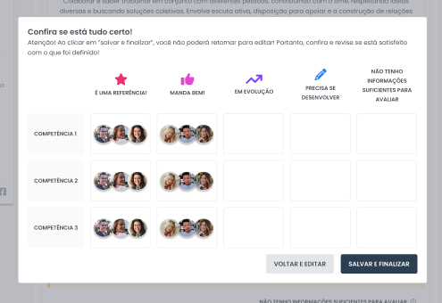 - Clique no nome da pessoa e depois selecione o parâmetro que mais se adequa à sua percepção sobre aquela competência.